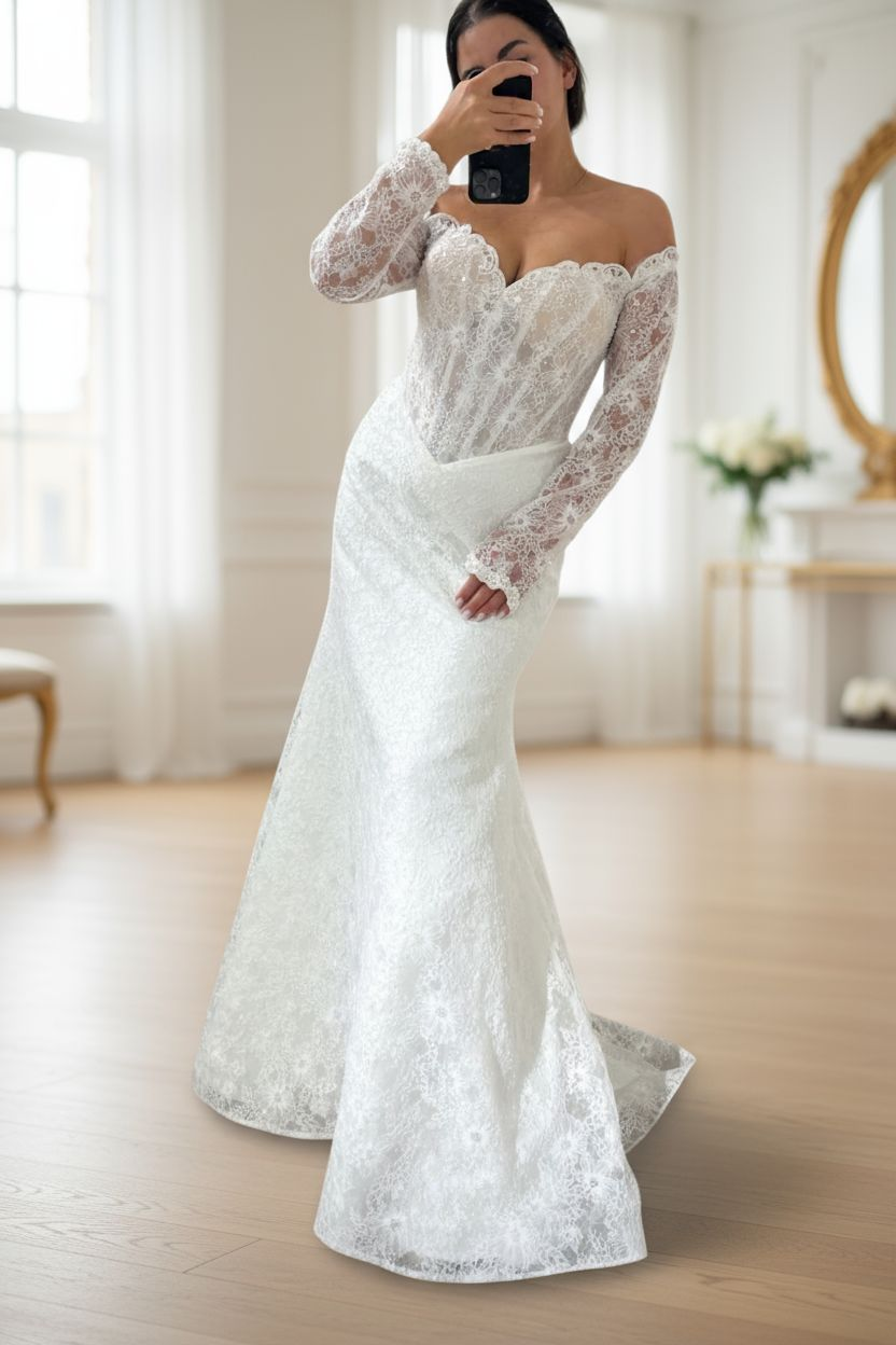 Sophistiquée et sculpturale, cette robe épouse les courbes avec élégance. Son bustier en cœur et ses manches longues en dentelle délicate créent un équilibre parfait entre sensualité et classicisme. Une pièce idéale pour les mariées qui veulent un look couture et intemporel.
