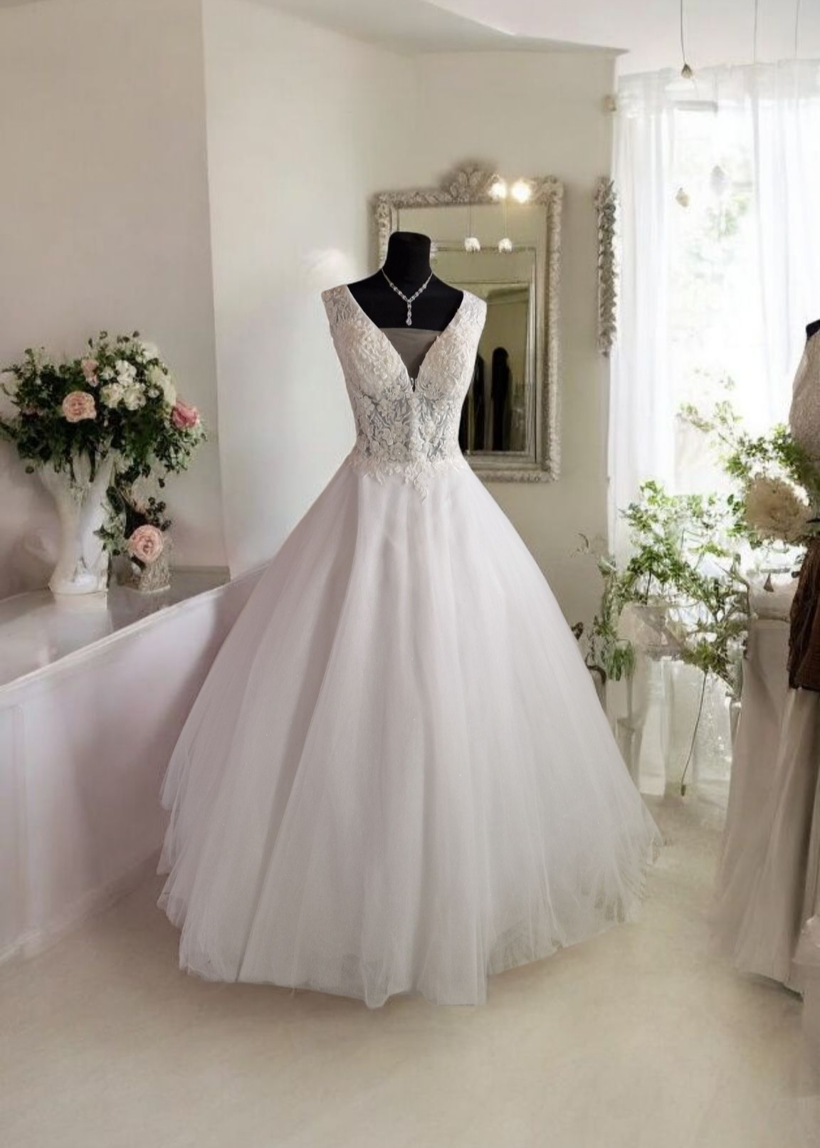 Une superbe robe de mariée laçage dos, parfaite pour maintenir les poitrines fortes. Pailletée