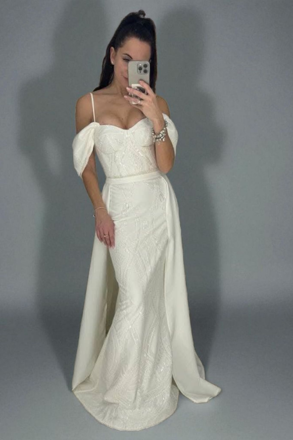 Minimaliste et élégante, cette robe bustier pailletée se distingue par son drapé structuré et glamour. Une coupe intemporelle et raffinée. Laçage dos pour un ajustement idéal. Traîne amovible
