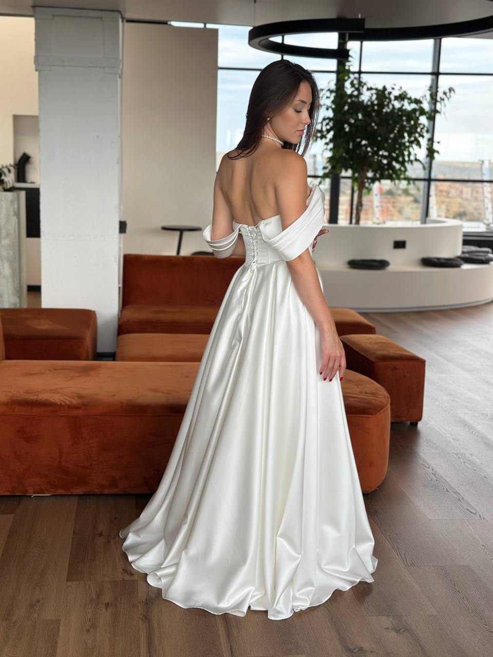 Élégance royale avec ce corset structuré et son décolleté en cœur sublimé par des plis croisés. La jupe ample en satin soyeux assure une allure majestueuse. Laçage dos pour un maintien parfait.
