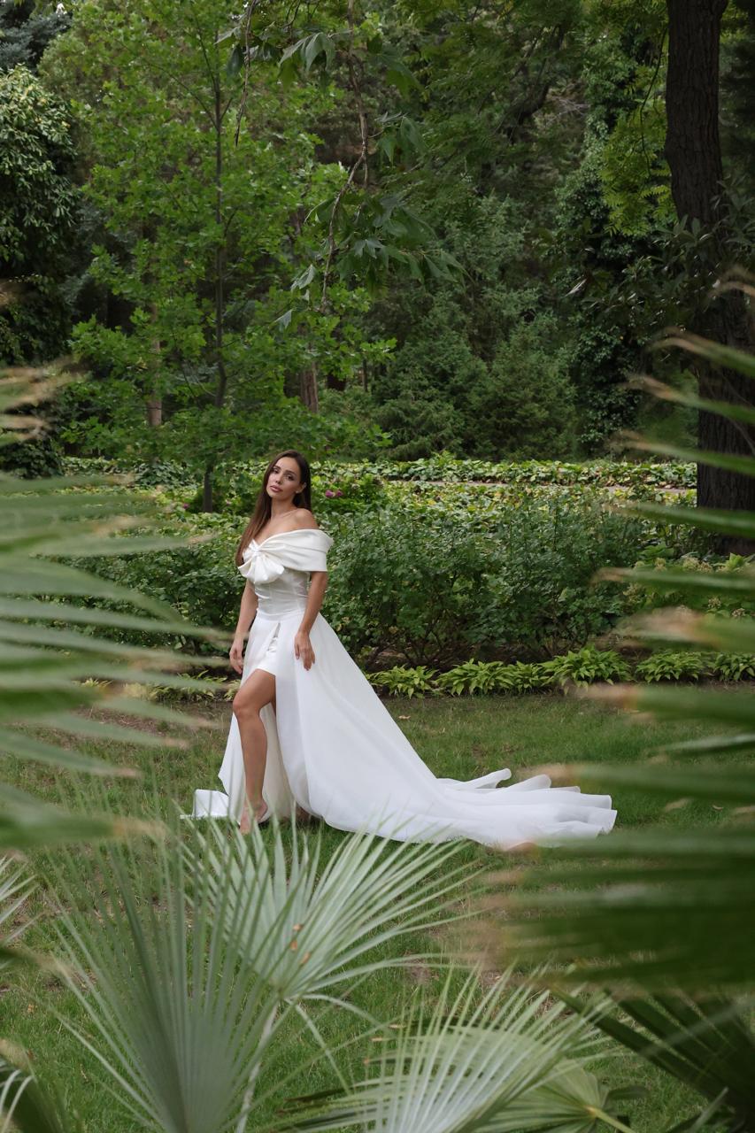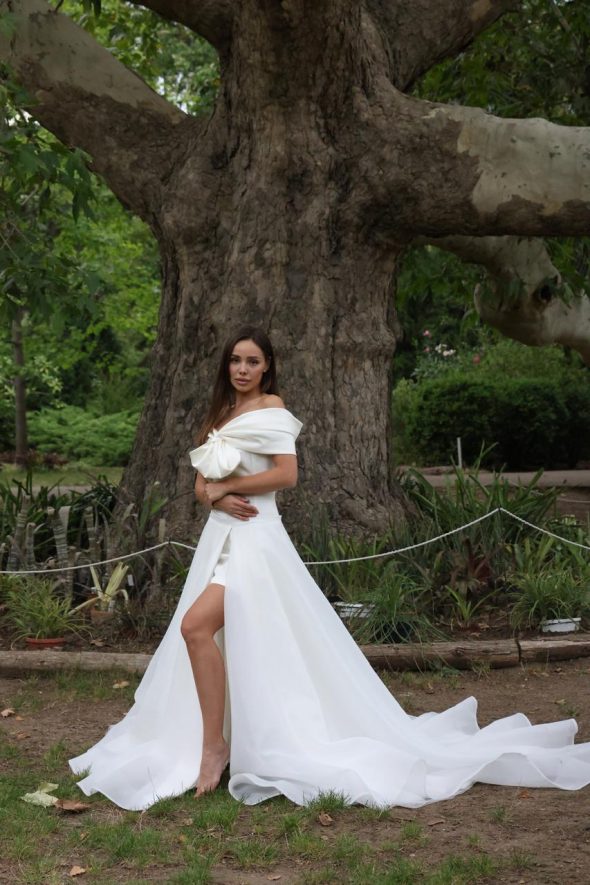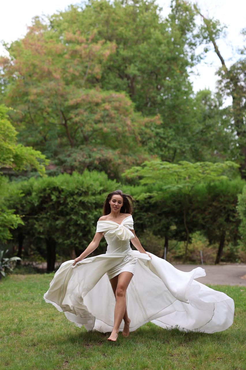 Une robe de mariée courte coordonnée à une grande traîne, parfaite pour changer de look durant la journée !