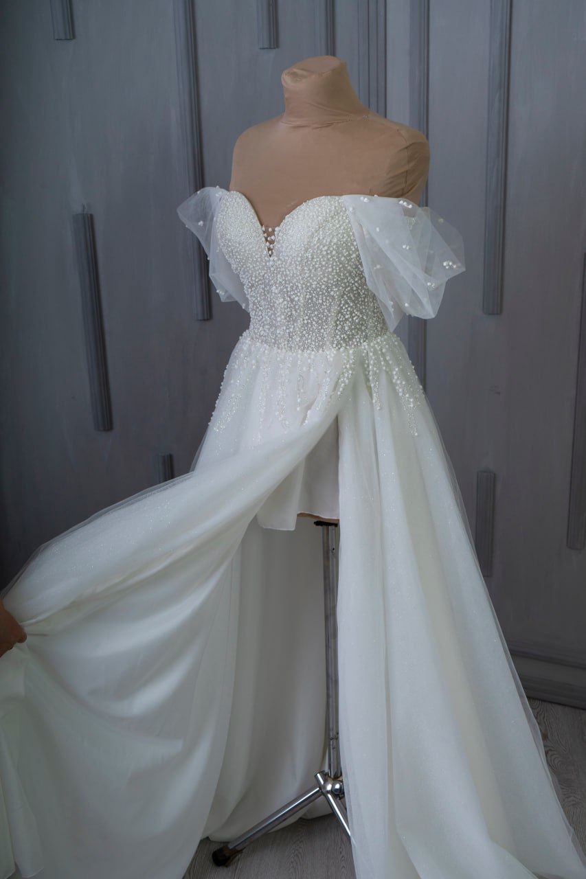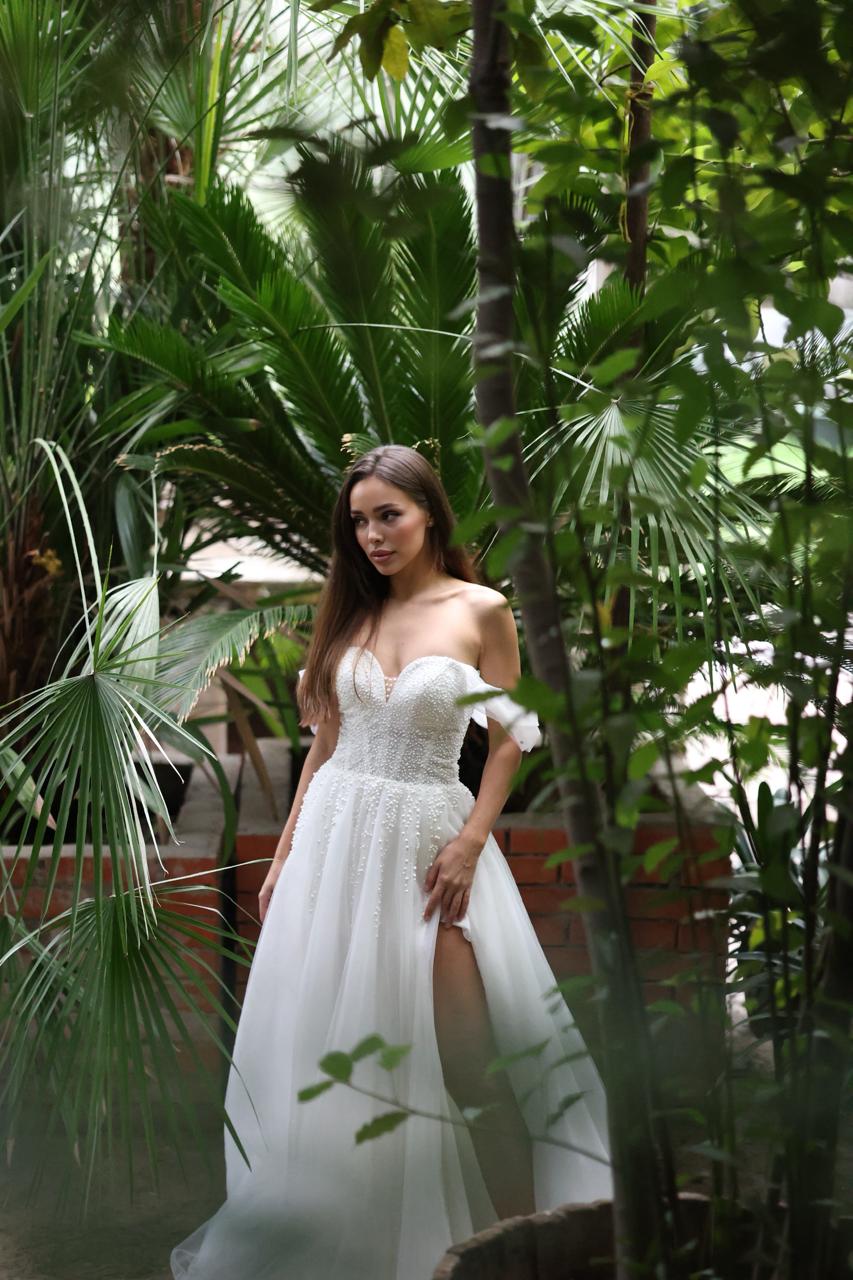 Robe de mariée glamour, entièrement pailletée, dentelle en relief effet perle. La fente lui donne un aspect moderne, amplifié par les bretelles bâteau. Laçage dos pour un ajustement parfait. Une robe au goût du jour très prisée.